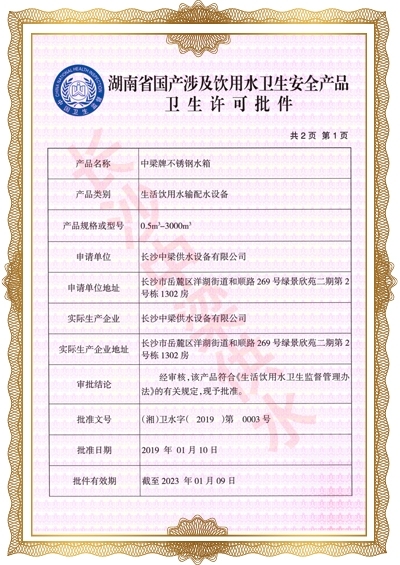 長沙中梁供水設(shè)備有限公司已先后通過湖南省衛(wèi)生廳國產(chǎn)涉及飲用水衛(wèi)生產(chǎn)品衛(wèi)生許可批準;